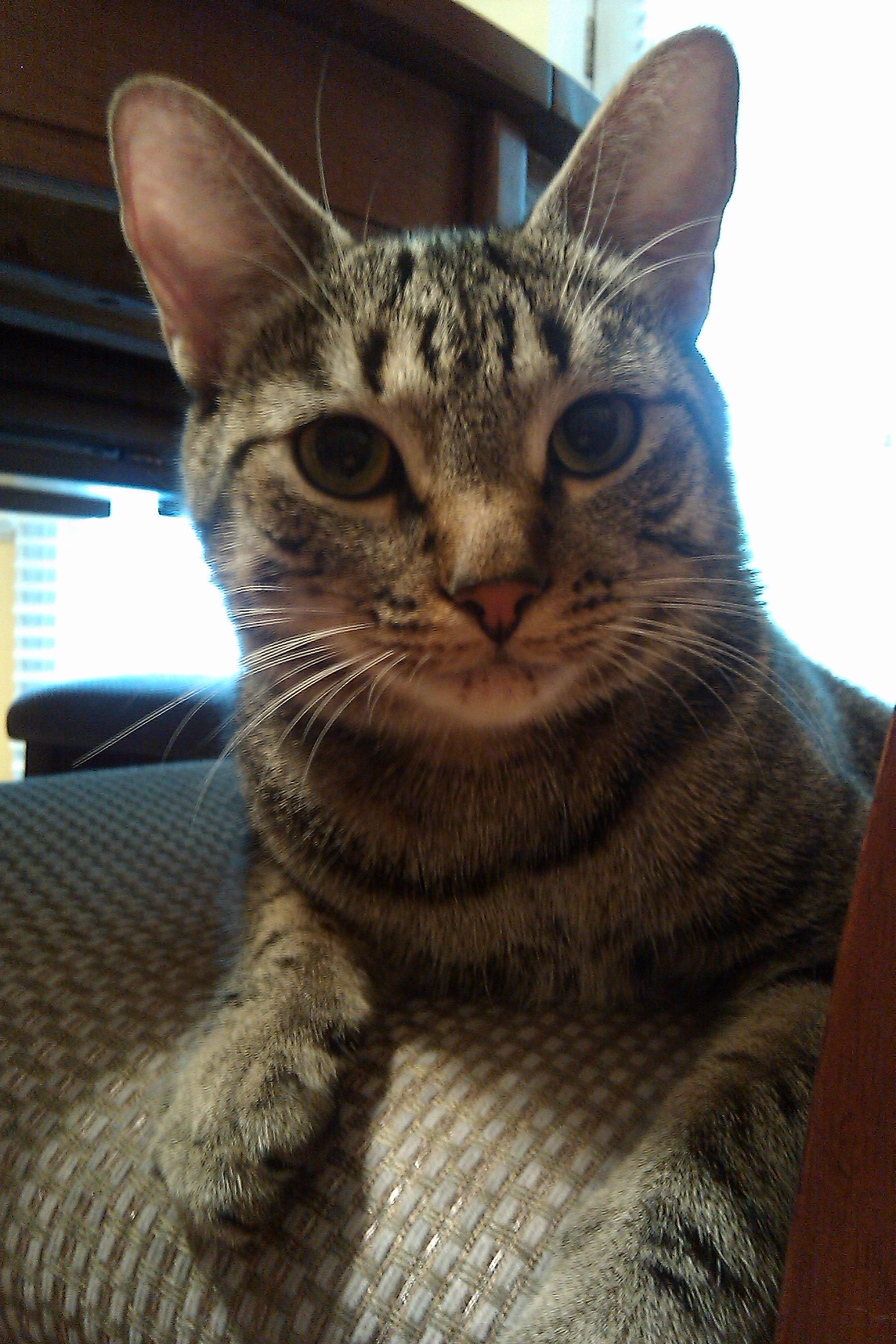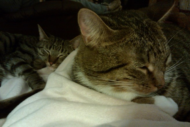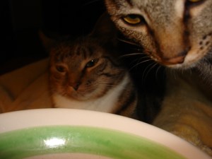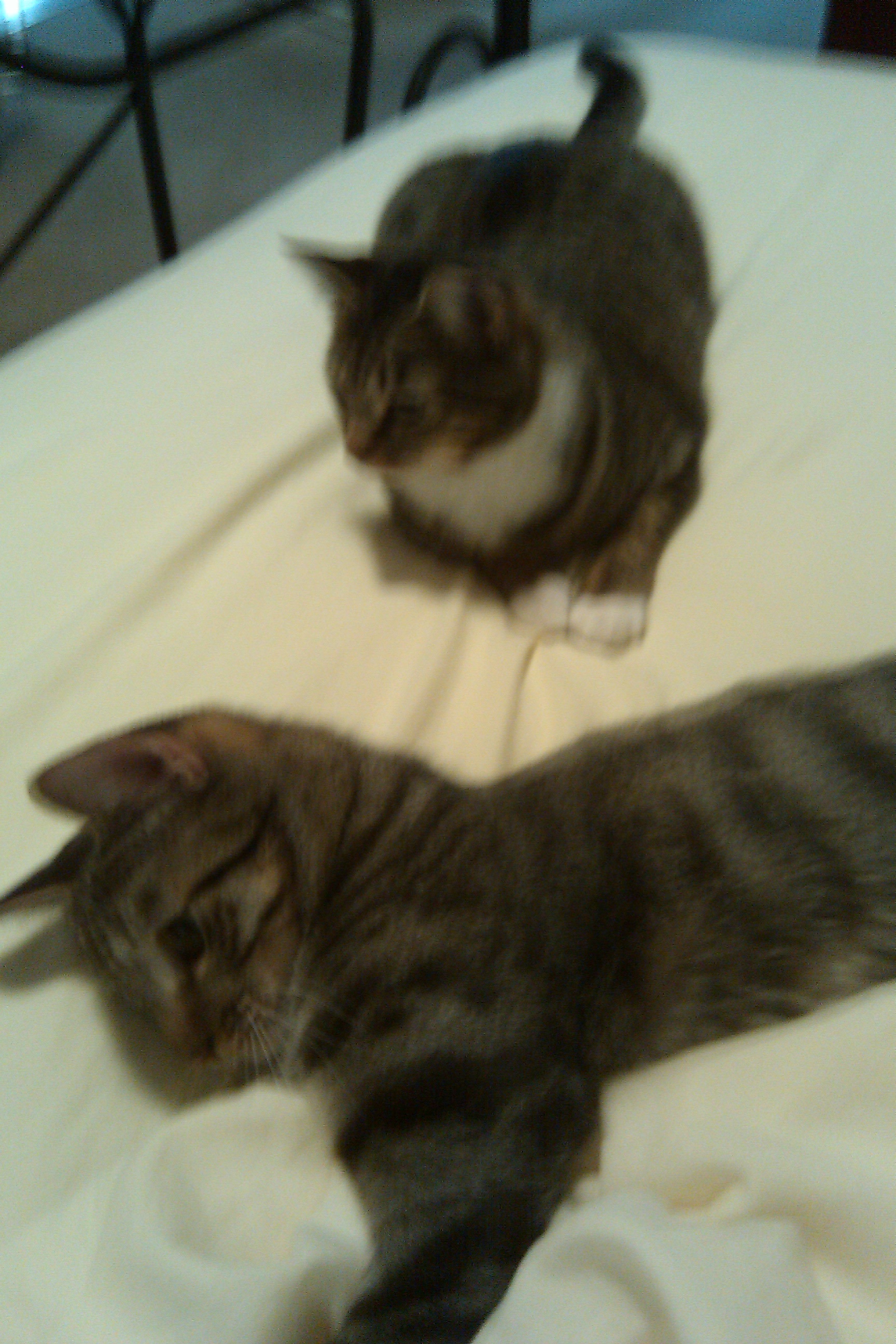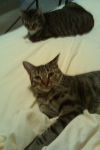 Even though the cats are technically our son’s Alex’s, they find themselves on our bed at night. (Probably because they have annoyed Alex and he has either shut his door or does better at ignoring them.)