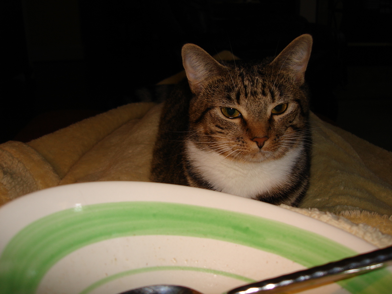 Fudge approaches the dance floor by pawing at the covers, beginning at my feet and then generally moving upwards. During colder weather, this isn’t too much of a problem as the covers are thicker, but when the blanket is lighter, I catch a claw sometimes, and oww!