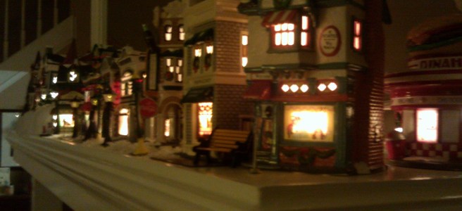 I’m having to readjust where I’m putting some things because of (cough) mischievousness cats, but I did manage to get through at least seven or eight boxes. There are more pieces that I probably won’t be putting out, and I’ve yet to put out the North Pole Series, however, here are the twinkling lights at night. They just make me smile. I can’t help it.